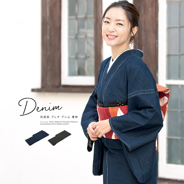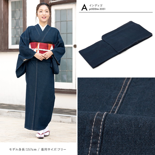 着物 デニム 洗える着物 単衣 レディース 紺 インディゴ 黒 ブラック 無地 シンプル 綿 カジュアル 洗える 浴衣 和遊楽 フリーサイズ