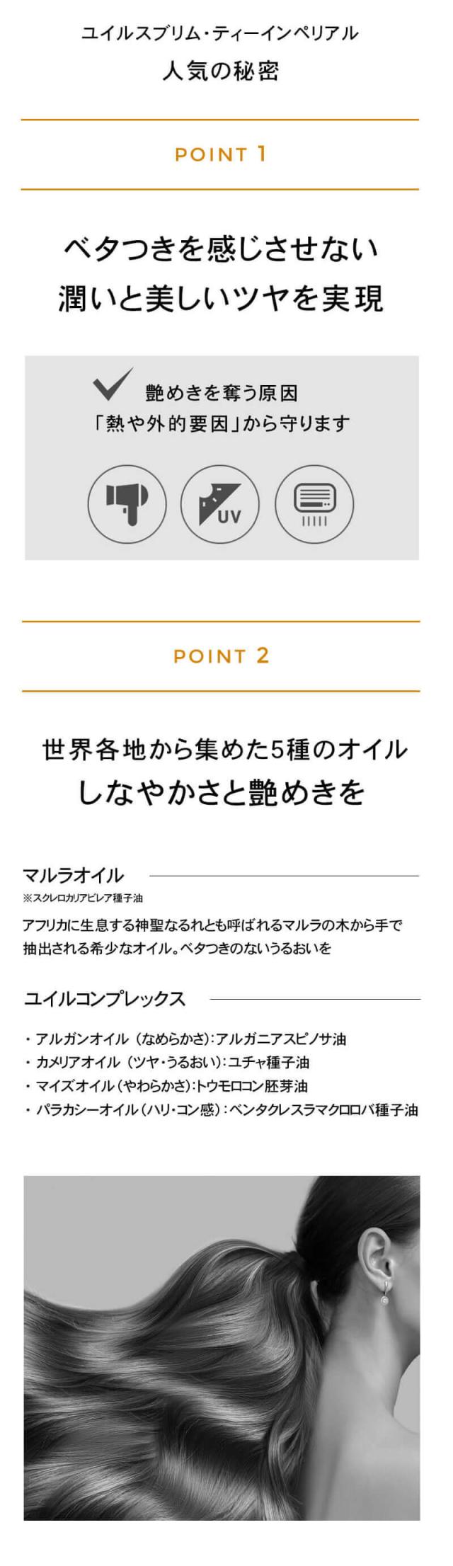 バランスの良いしなやかな質感へ導くオイルタイプの洗い流さないヘアトリートメント