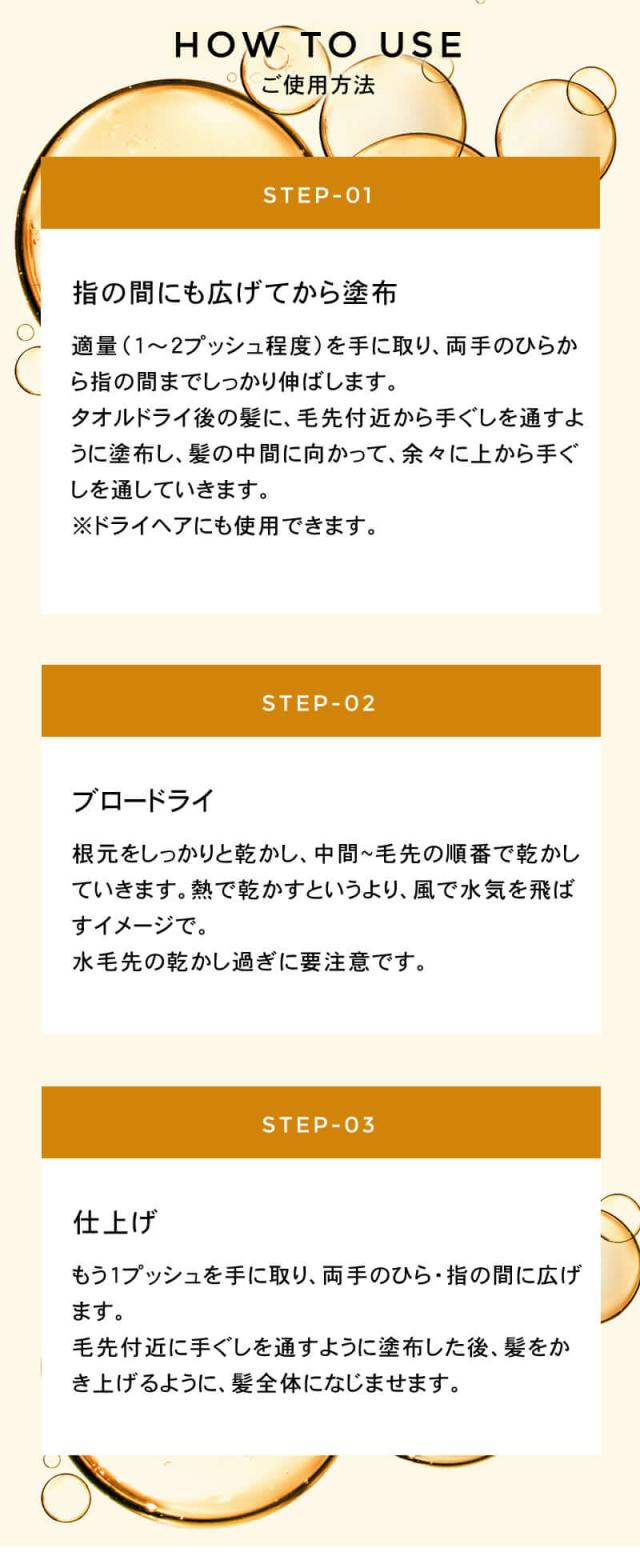 適量(1〜2プッシュ程度)を手に取り、両手のひらから指の間までしっかり伸ばす。タオルドライ後の髪に、毛先付近から手ぐしを通すように塗布し、髪の中間に向かって徐々に上から手ぐしを通していきます。(ドライヘアにも使用できます。)