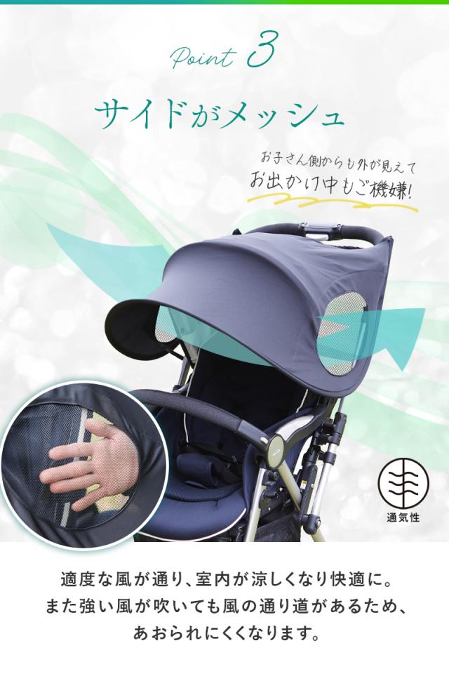 サイド部分は風通しのいいメッシュ素材で、お子様も外を眺めることができます。