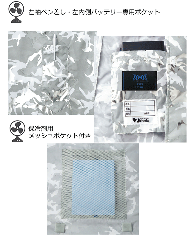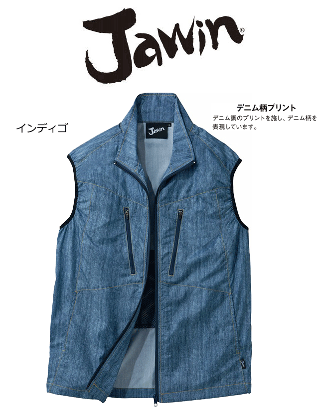 光沢感のあるカモフラ柄とデニム柄をプリントしたカジュアルテイスト空調服。