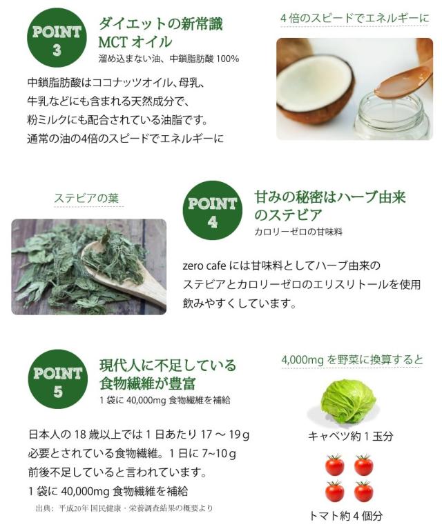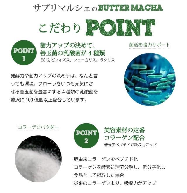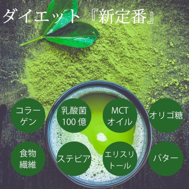 | 原材料 | 抹茶粉末(日本)、バターパウダー、 難消化性デキストリン、デキストリン、MCTオイルパウダー、エリスリトール ステビア、コラーゲン、オリゴ糖、乳酸菌(EC-12、フェーカリス、ラクリス)、ビフィズス菌、香料 |