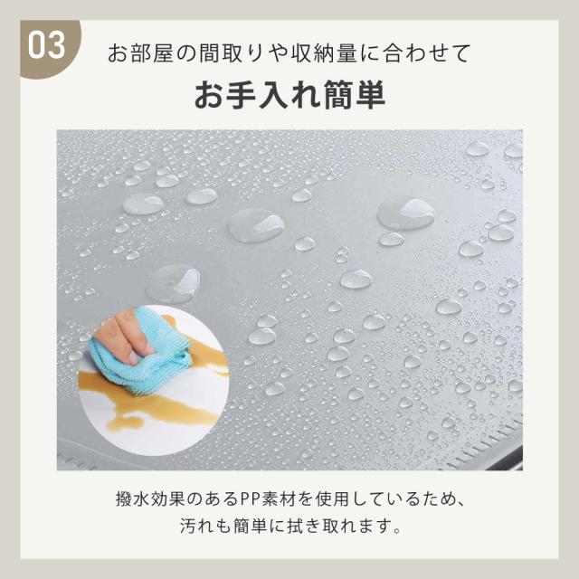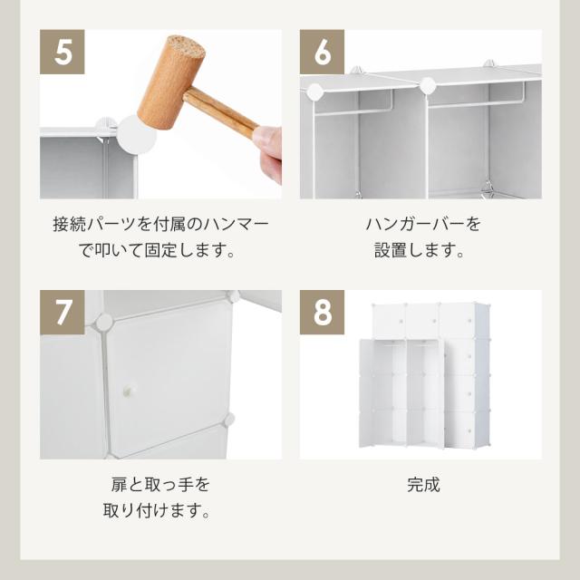 ![]() ![]() ![]() ![]() ![]() ■ブロックのようなシンプルなデザインで、すっきりと収納できる。 1セットで12ボックス分まで組み立て可能。一人分の衣類がまとめて入る 大型クローゼットに。 ![]() ■設置場所の環境やスペースに合わせて、ボックスのレイアウトを自由自在に変更可能。 1ボックスだけでも使えるので、すき間収納やスポット収納にも便利。 ■シンプルなデザインで衣類収納以外にもさまざまな用途で使える。台所であふれがちな調味料や食材、散らかりがちなおもちゃなどの収納に。 また、フィギュアや観葉植物などのディスプレイラックとしても活躍! ![]() ■重量は1ボックスあたり1kgと軽量なので、お部屋の模様替えやレイアウトを変える際も、組み立てた状態で簡単に移動することが出来ます。引っ越しや使わなくなった際は分解してしまえるのでお部屋からの運び出しもラクラク。 ![]() ![]() ■パネルと接続パーツを繋ぐだけでクローゼットに! 女性ひとりでも工具不要で簡単に組み立てできます。 (1セットの組み立て時間も目安:60分) レイアウト変更や解体時に便利な仕上げ用ハンマーが付属。 パネルには撥水効果のあるPP素材を使用しているため、汚れも付きにくい。 ![]() ![]() ■オプションパーツの取り付けで収納力と使いやすさアップ! ・コートやジャケットなどの大物衣類のつり下げに便利なハンガーバー ・開閉時に便利なつまめる取っ手はホコリなどが入り込みにくく、 パネルに必要な部分にだけ取り付け可能 ・扉用パネルにつなげることで高さのあるレイアウト時も 扉がバラバラにならず開け閉めしやすい ![]() ![]() ![]() ![]() ![]() ![]() ![]()
