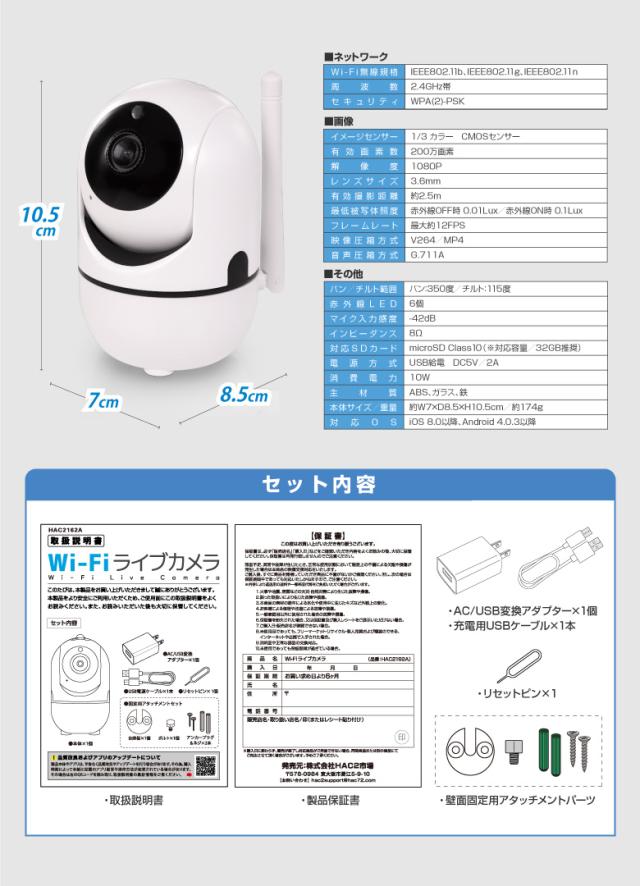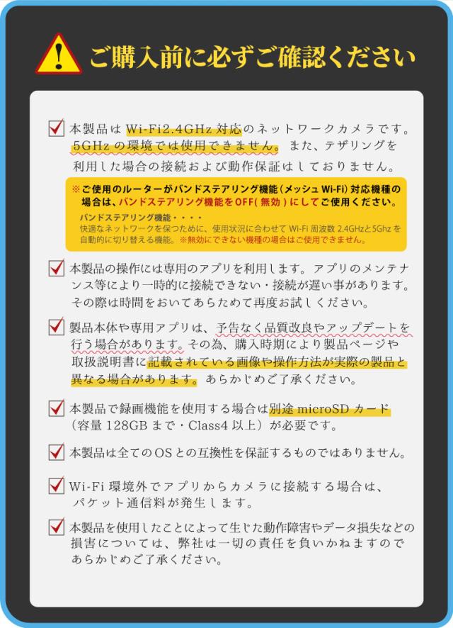 留意事項:※本製品のご使用にはWi-Fi環境が必要です。また、Wi-Fiの周波数は【2.4GHz】のみ対応しております。事前に必ずご利用になるWi-Fi環境の周波数が2.4GHzか確認してください。