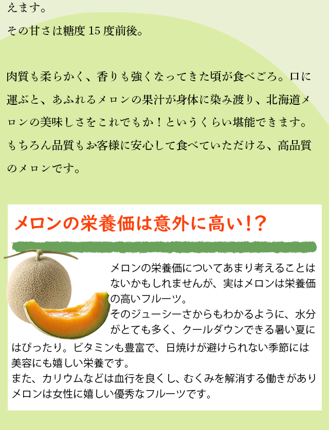 甘さもしっかり、果肉もしっかりで夏をたっぷり味わえるおいしいメロンです。