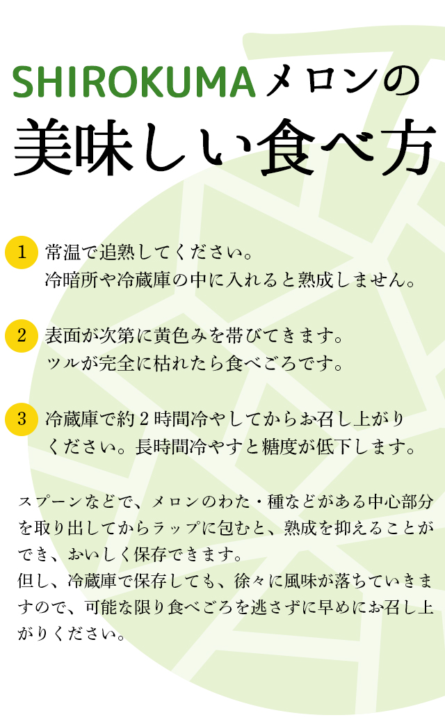 常温(20℃〜25℃の間で保管して、メロンの果皮が青緑色から「やや黄色」になって、メロンの香りが強くなったら一番の食べ頃です。食べる前に冷蔵庫で冷やしてお召し上がりください。