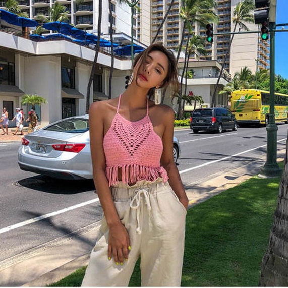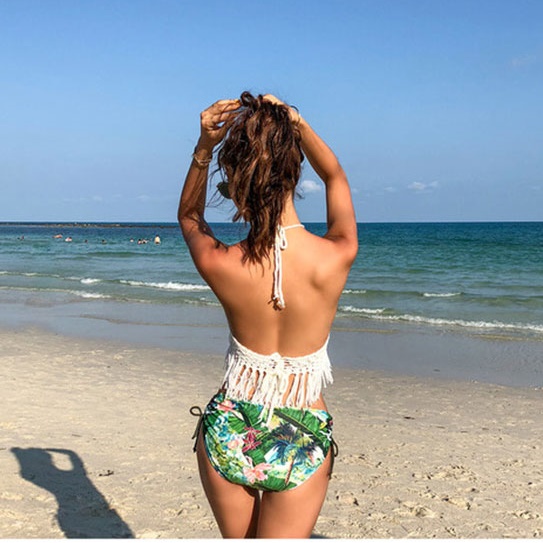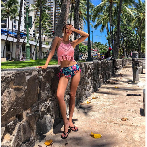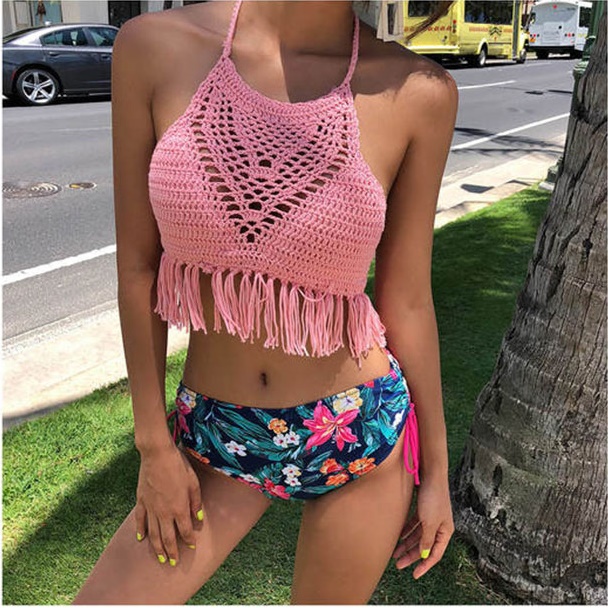 セクシー 水着 ビキニ ブラジリアン ハイネック 水着 2019新作水着 編み込み クロシェ フリンジ タッセル ニットビキニ ホルターネック トロピカル柄 20代 30代 40代 韓国ファッション おしゃれ キュート レディース