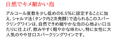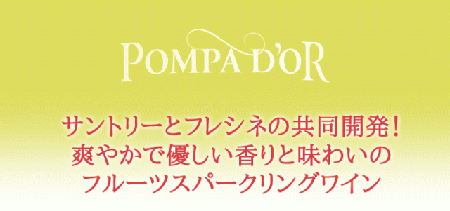 爽やかで優しい香りと味わいのフルーツスパークリングワイン!サントリーと、世界No.1スパークリングワイン“フレシネ”で有名なフレシネ社と共同開発したフルーツスパークリングワイン“ポンパドール”!日本人の嗜好にあった優しい香りと味わいのフルーツスパークリングワインで、そのおいしさと爽やかな口当たりで大好評!ライチの香り・味わいをすっきり楽しめる甘口スパークリング。シャルマ法(タンク内2次発酵)により、自然できめ細やかな泡による心地よい口当たりと、少し低めのアルコール度数(6%)に設定し、軽やかで飲みやすい味わいが魅力的です。◆POMPA D’OR Litchi◆ワイン種類:スパークリングワイン◆テイスト:やや甘口 ◆生産地:スペイン / ペネデス◆生産年:N.V. ◆内容量:750ml