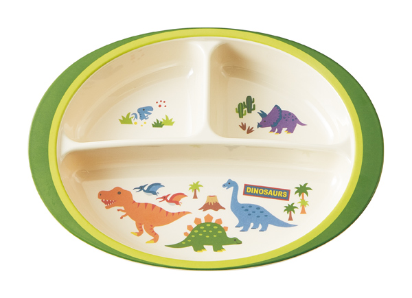 ディノサウルスの軽くて割れにくいメラミン製の子供用ランチプレートです。大好きなキャラクターで食事タイムがもっと楽しくなります♪