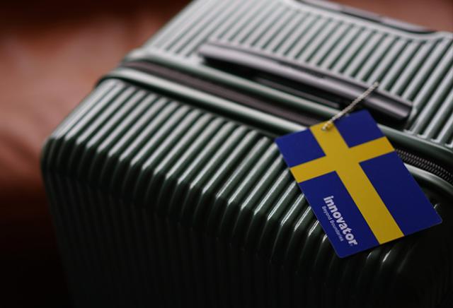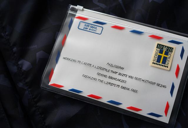 | ORIGINAL POUCH エアメールをモチーフにしたオリジナルポーチは付属品のひとつです。 | ORIGINAL LUGGAGE TAG スウェーデン国旗をモチーフにしたオリジナルラゲッジタグ |