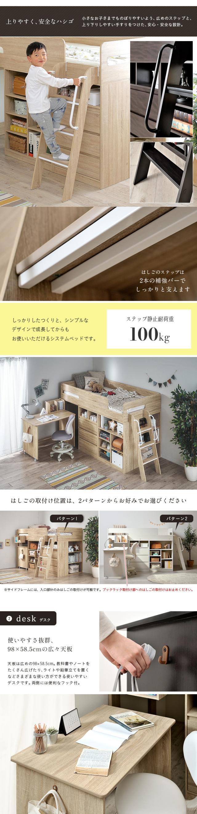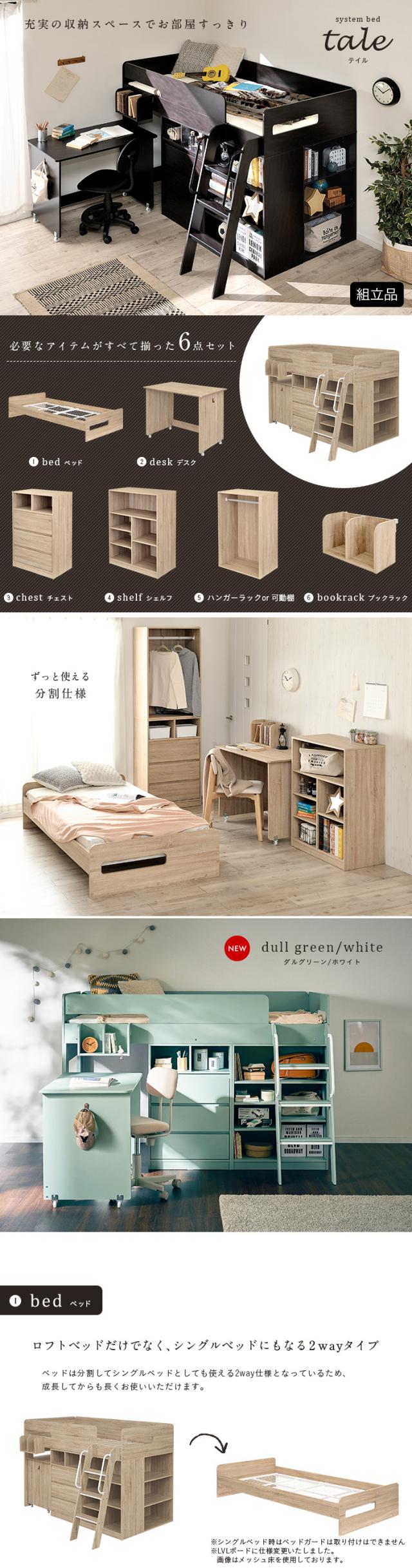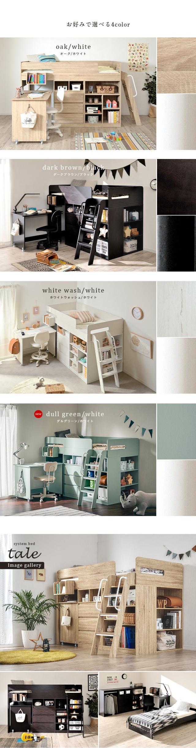 【充実の収納スペース】システムベッド ロフトベッド システムデスク システムベッドデスク デスクベッド ロータイプ ミドル ベッド 机付き 学習机 子供 ハンガーラック 本棚 収納 子供部屋 tale(テイル) 4色対応