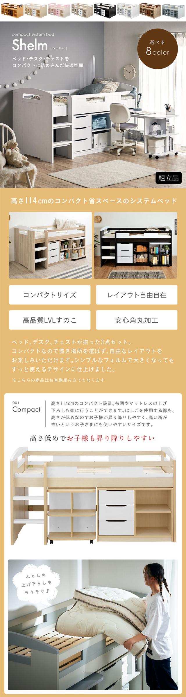 システムベッド Shelm4(シェルム4) 8色対応 ロフトベッド ロフトベット システムデスク システムベッドデスク デスクベッド ロータイプ 机付き 学習机 学習デスク 子供部屋 木製 大人 子供 本棚
