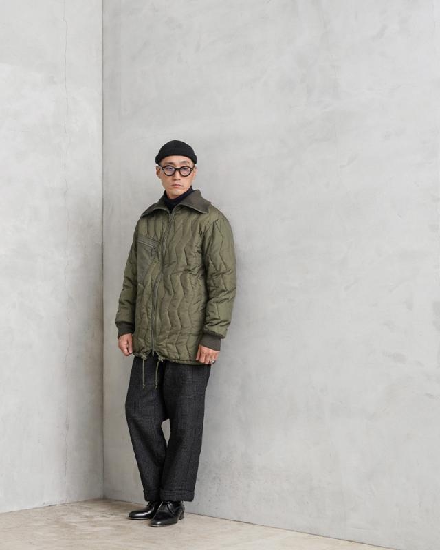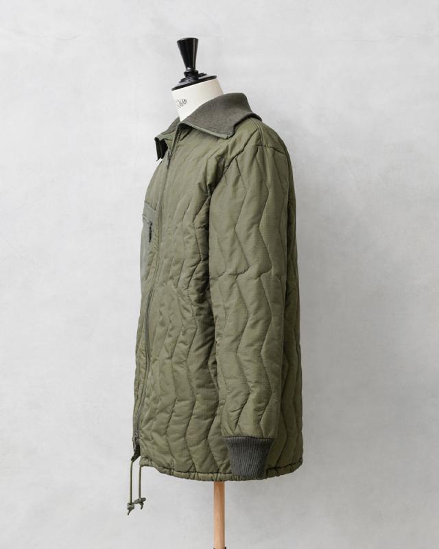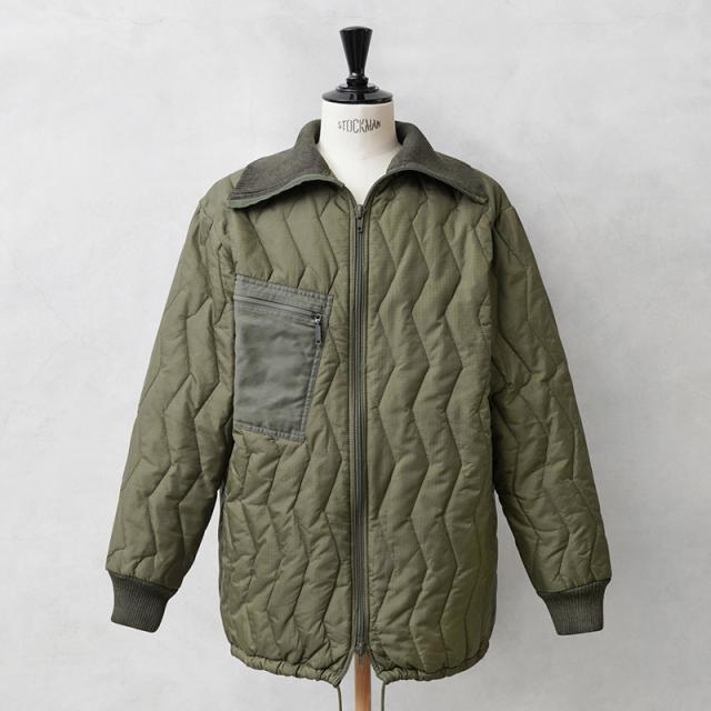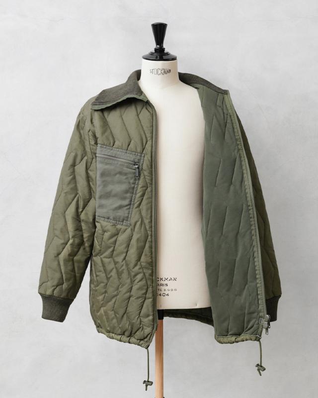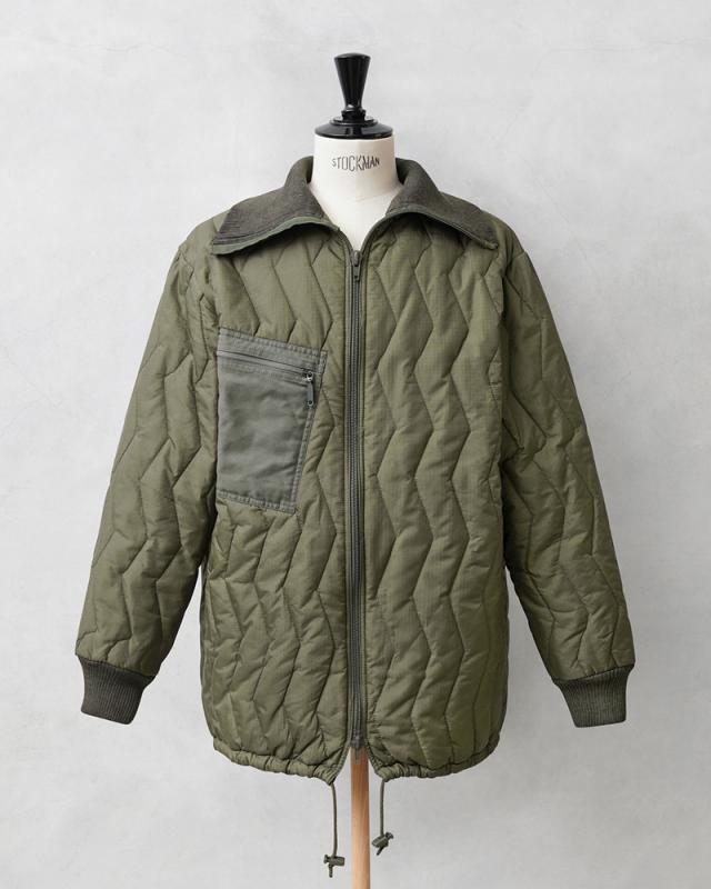 近年買い付けに行っても中々見かけることができなくなってきたドイツ軍キルティングライナージャケットです。昨今、様々なミリタリーライナーに人気が集まり、今ではライナーをアウターとして着られるようになり、主役として活躍するアイテムになりました!レイヤリングシステムと同様に重ね着をして保温するデザインなので、ポケットやドローコード、リブなどが付属したジャケット仕様のアイテムとなっています。フロントはダブルジッパーでシルエットに変化を持たせることができるので着こなしの幅が広がります。胸のジッパー開閉のポケットの絶妙な配置にデザイン性にも優れたキルティングのステッチ、長めのリブ襟、脇下のベンチレーションがムレを防ぐこだわられた作りです。
