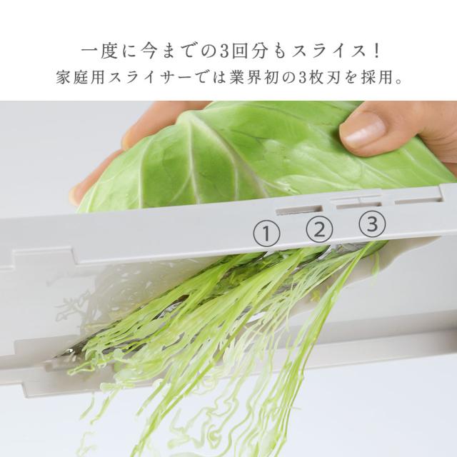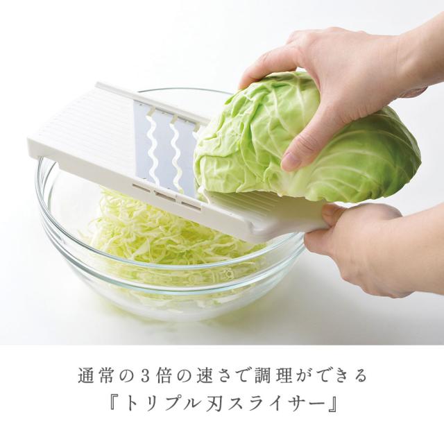 家庭用スライサーでは業界で初めての3枚刃を採用!文字どおり3倍の速さで調理できるスピードスライサーです。