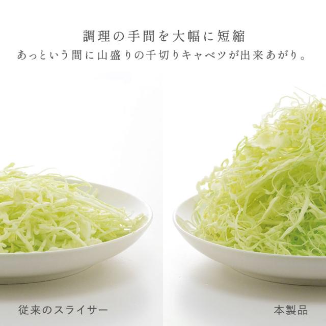 調理の手間を大幅に短縮することができ、特に手間のかかるキャベツの千切りに威力を発揮する時短調理器具です。