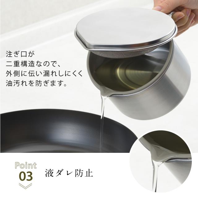 注ぎ口は2重構造なので、外側につたい漏れしにくく、油汚れを防ぐことができます。