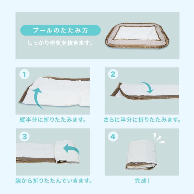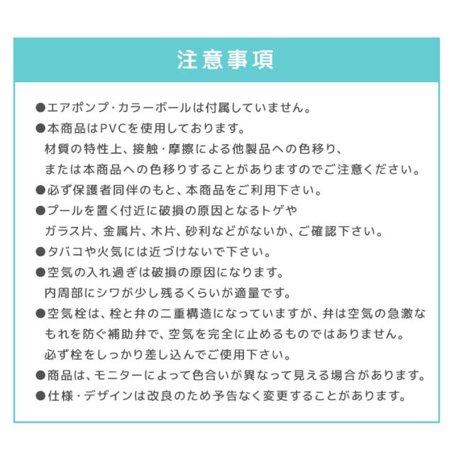 | 注意事項 | ・エアポンプは付属していません。 ・本商品はPVCを使用しております。材質の特性上、接触・摩擦による他製品への色移り、または本商品への色移りすることがありますのでご注意ください。 ・必ず保護者同伴のもと、本商品をご利用下さい。 ・本品は水深が深くなるため、対象年齢未満のお子様は使用しないで下さい。 ・プールを置く付近に破損の原因となるトゲやガラス片、金属片、木片、砂利などがないか、ご確認下さい。 ・タバコや火気には近づけないで下さい。 ・空気の入れ過ぎは破損の原因になります。内周部にシワが少し残るくらいが適量です。 ・空気栓は、栓と弁の二重構造になっていますが、弁は空気の急激なもれを防ぐ補助弁で、空気を完全に止めるものではありません。必ず栓をしっかり差し込んでご使用下さい。 ・プールは安定した平らな場所でご使用下さい。傾斜のある場所、タイル・煉瓦など目地や段差のある場所でのご使用は変形・破損の原因になりますので避けて下さい。また、表面に塗装・コーティング等の処理された場所でのご使用は塗装等が変色したりプール本体に色移りすることがあります。ご注意下さい。 ・商品は、モニターによって色合いが異なって見える場合があります。 ・仕様・デザインは改良のため予告なく変更することがあります。 |