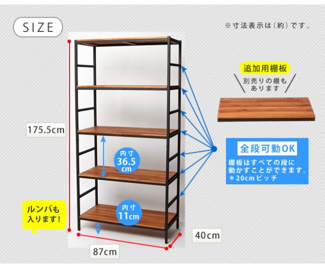 オープンラック オープンシェルフ 5段 幅86 奥行40 BRICK アイアン スチールラック 天然木製 棚板