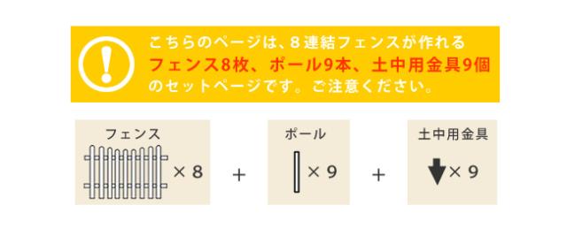 | ■商品名 | ピケットフェンスU型 8連結セット(土中用) ・フェンス…8枚 ・ポール…9本 ・土中用金具…9個 |