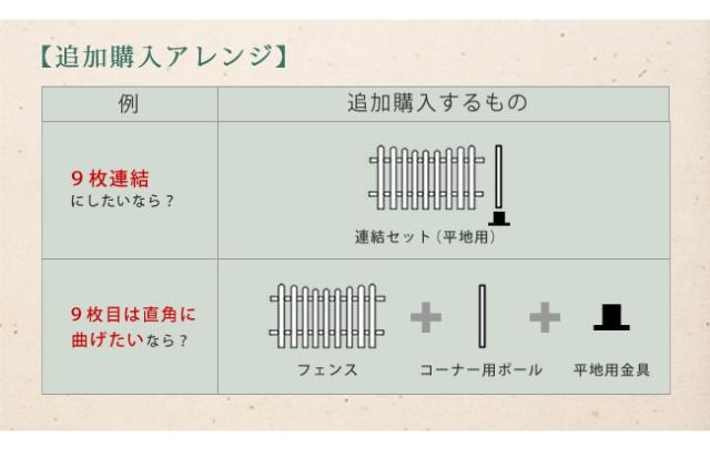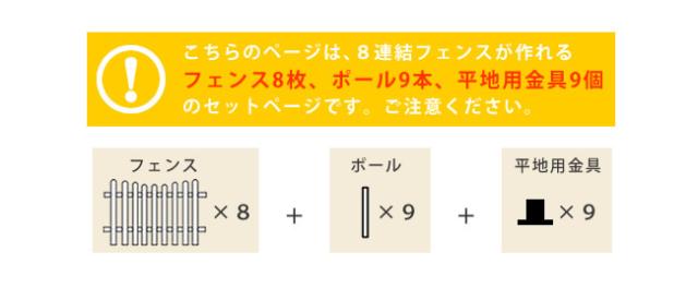 | ■商品名 | ピケットフェンスU型 8連結セット(平地用) ・フェンス…8枚 ・ポール…9本 ・平地用金具…9個 |