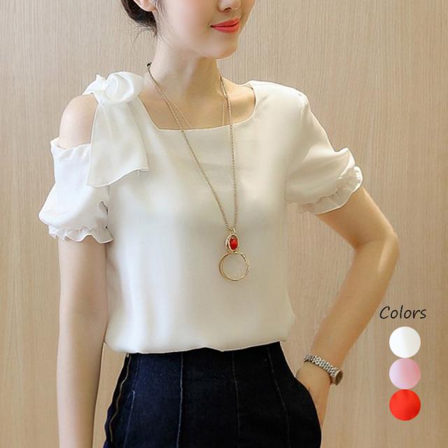 LAZA 肩出し シャツ リボン トップス 半袖 シャツ OL 通勤通学 シャツ ゆったり