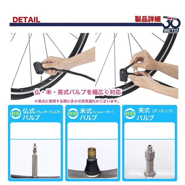 対応バルブ形式:米式、仏式、英式 ※英式バルブへの使用の場合、多少の空気漏れがございます。
