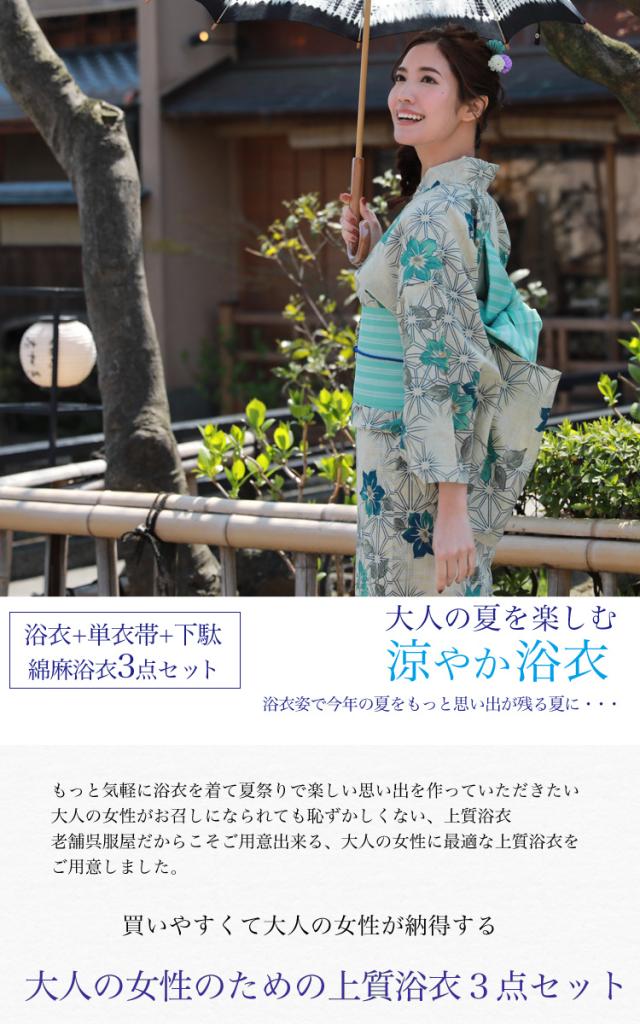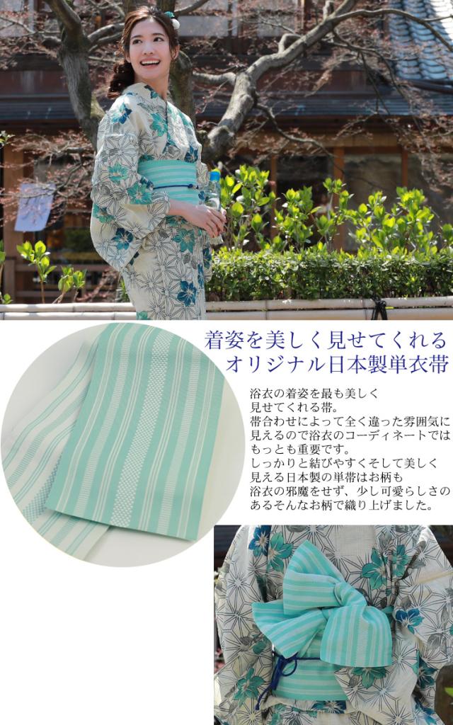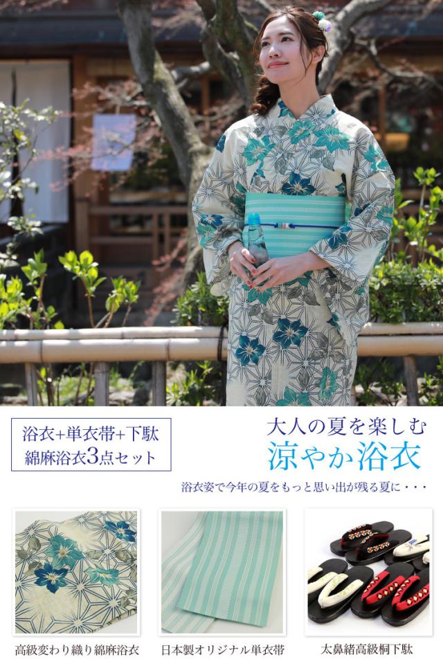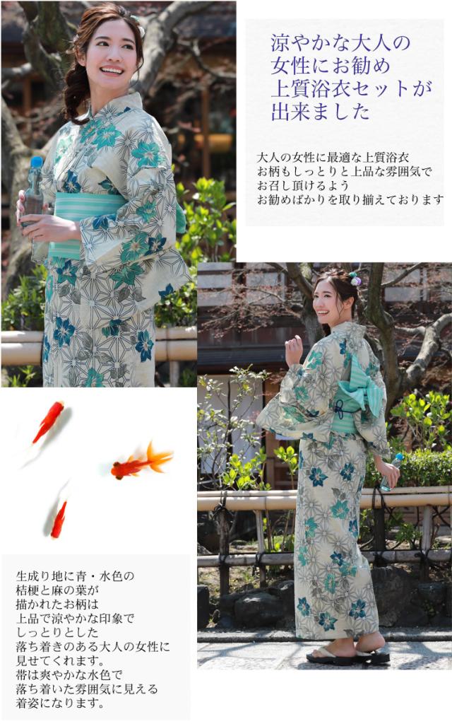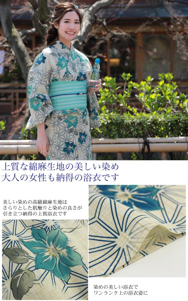 浴衣 セット レトロ レディース 大人 S M 高級変わり織り綿麻浴衣3点セット「生成り地に桔梗と麻の葉」浴衣 生成り 水色 青 桔梗 麻の葉