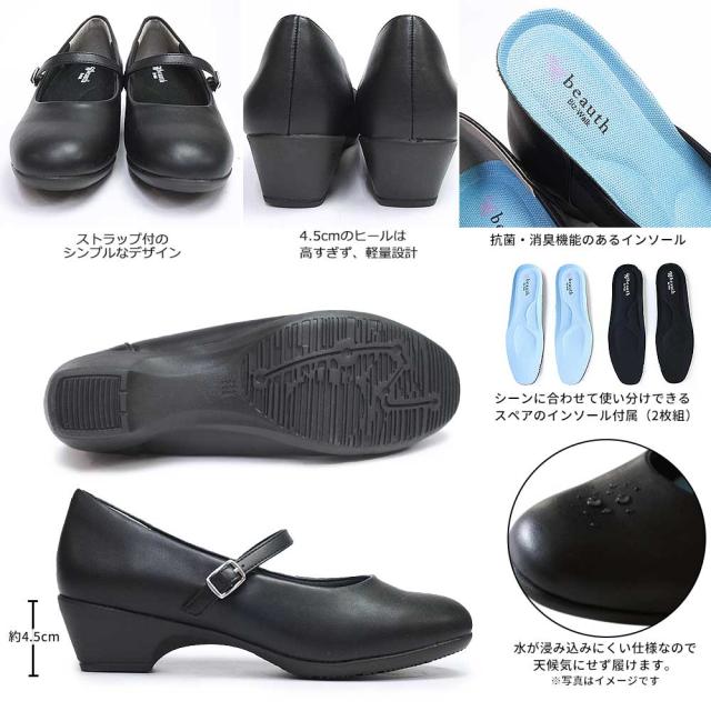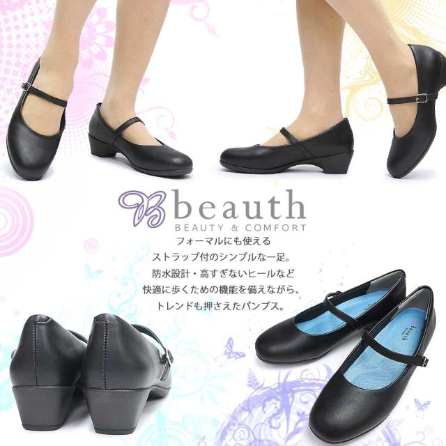 ビュース パンプス 防水 レディース BT-602 消臭・抗菌 黒 ブラック ストラップ フォーマル beauth 軽量設計