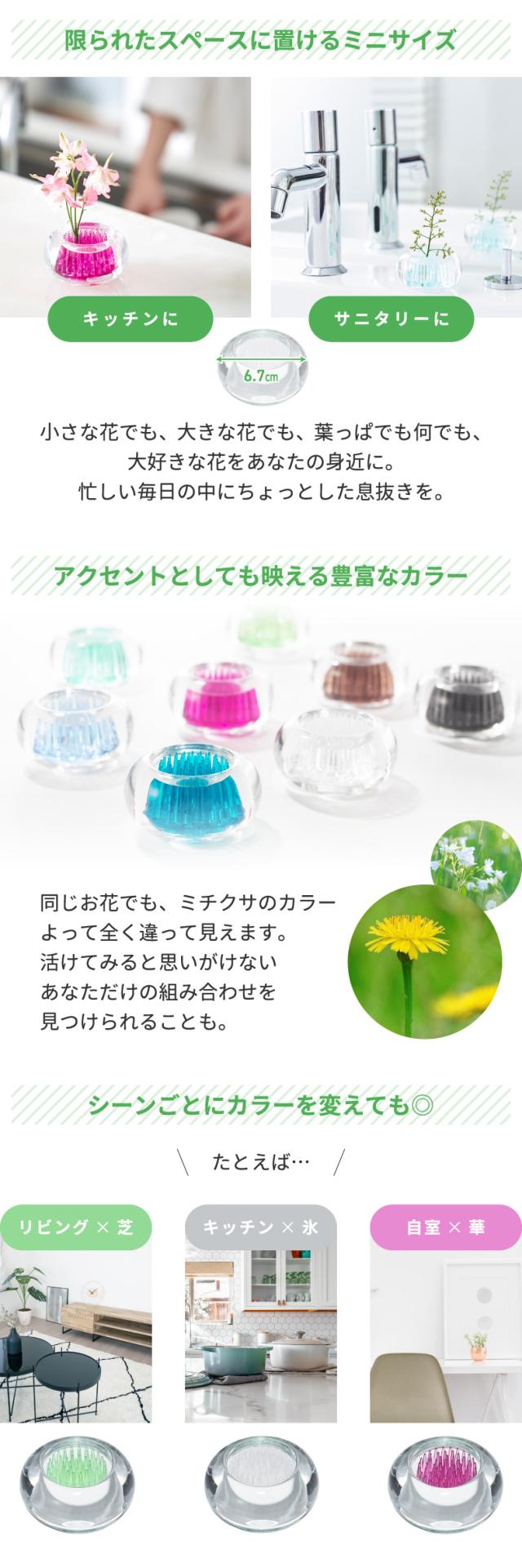 ●色々なカラーがあるので、お部屋のアクセントとして置くことも。リビングには「芝」、キッチンには「氷」、自分の部屋には「華」などシーンごとに変えるのもオススメです。同じお花を差しても、ミチクサのカラーによって全く違って見えます。活けてみると思いがけないあなただけの組み合わせを見つけられることも。