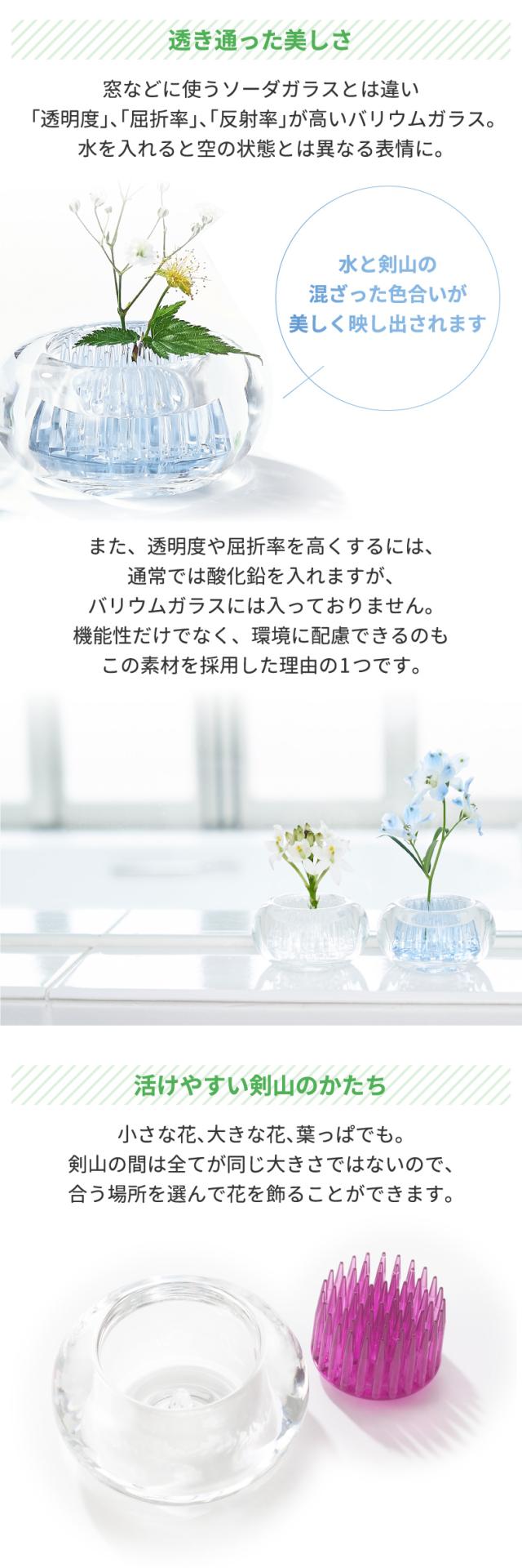 ●窓などに使うガラス(ソーダガラス)とは違い 「透明度」、「屈折率」、「反射率」が高いのが特徴です。そのため、水を入れると空の状態とは異なる表情に。透き通ったガラスに映る水と剣山の混ざった色合いが美しく映し出されます。