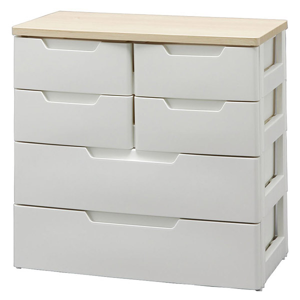 組み立て不要、小引き出し付き木天板のリビングチェストです。小引き出しには小物、大きい引き出しには衣類など、1つのチェストで様々なものを収納できます。金属スライドレール付きで、引き出しの開閉がラクラクです。引出しは取り外しができるので、季節によって入れ替えが可能です。