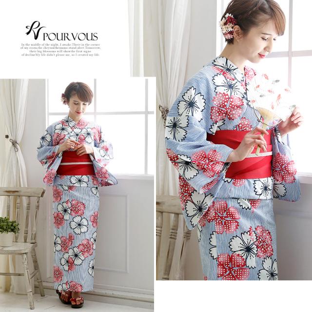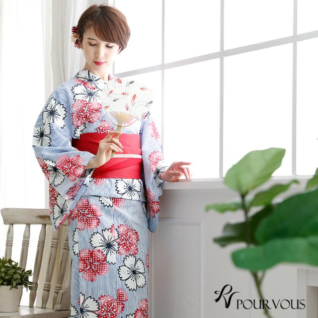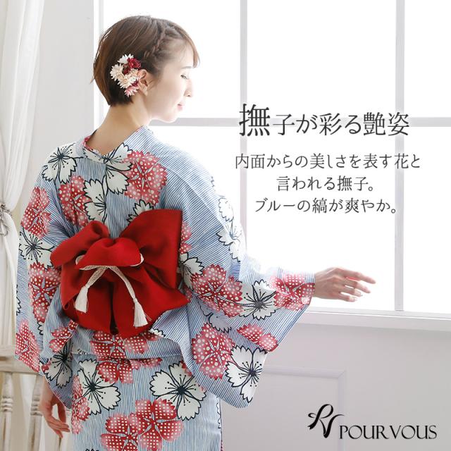 夏らしい爽やかな縞模様に鮮やかな撫子が散りばめられた美しい浴衣です。