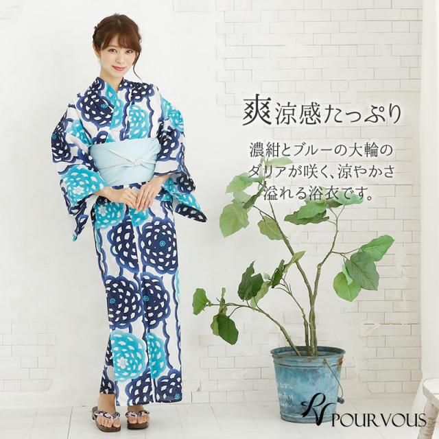 ★濃紺とブルーの大輪のダリアが咲く、涼やかさ溢れる浴衣です。