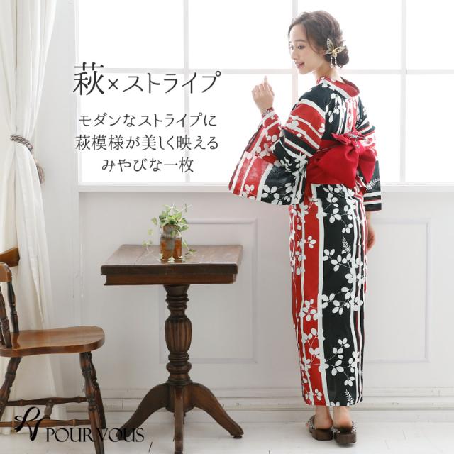 上品で大人っぽい赤と黒の縞模様に白く萩が散りばめられた艶やかな一枚。