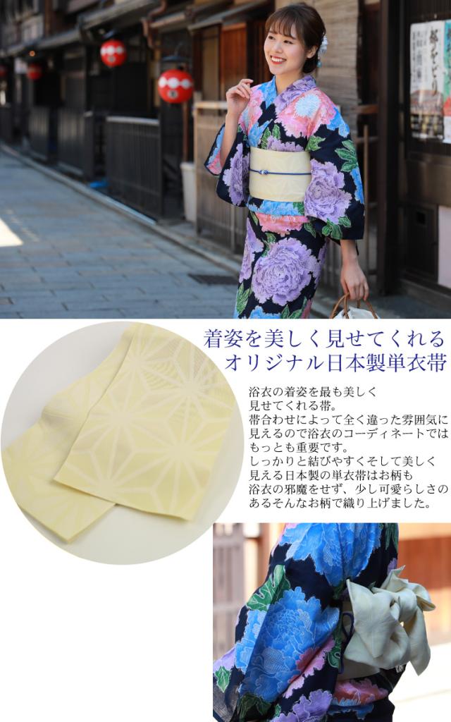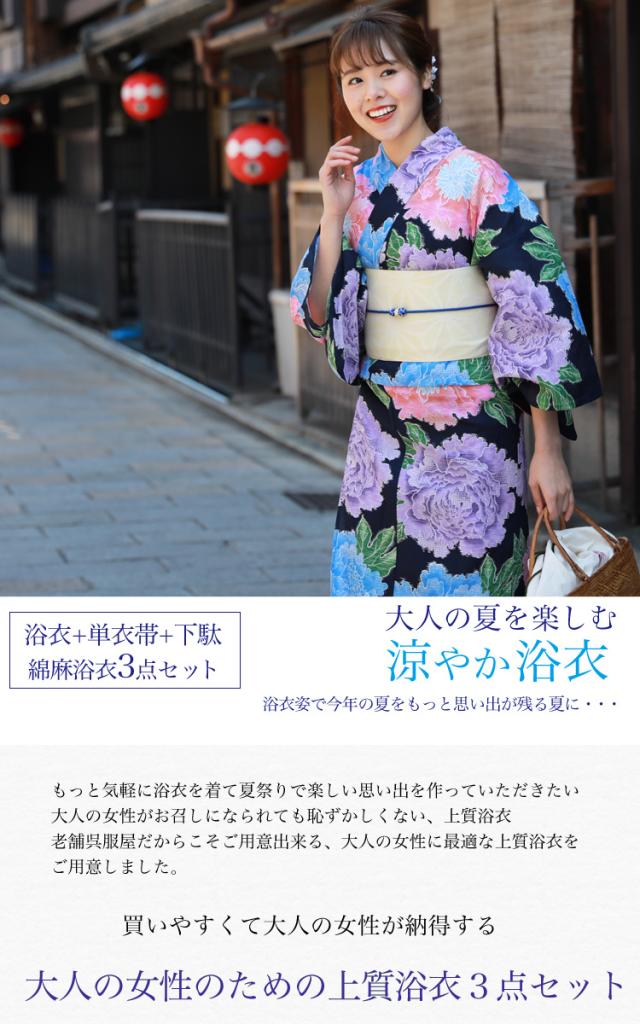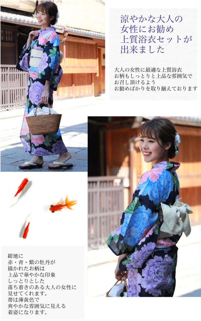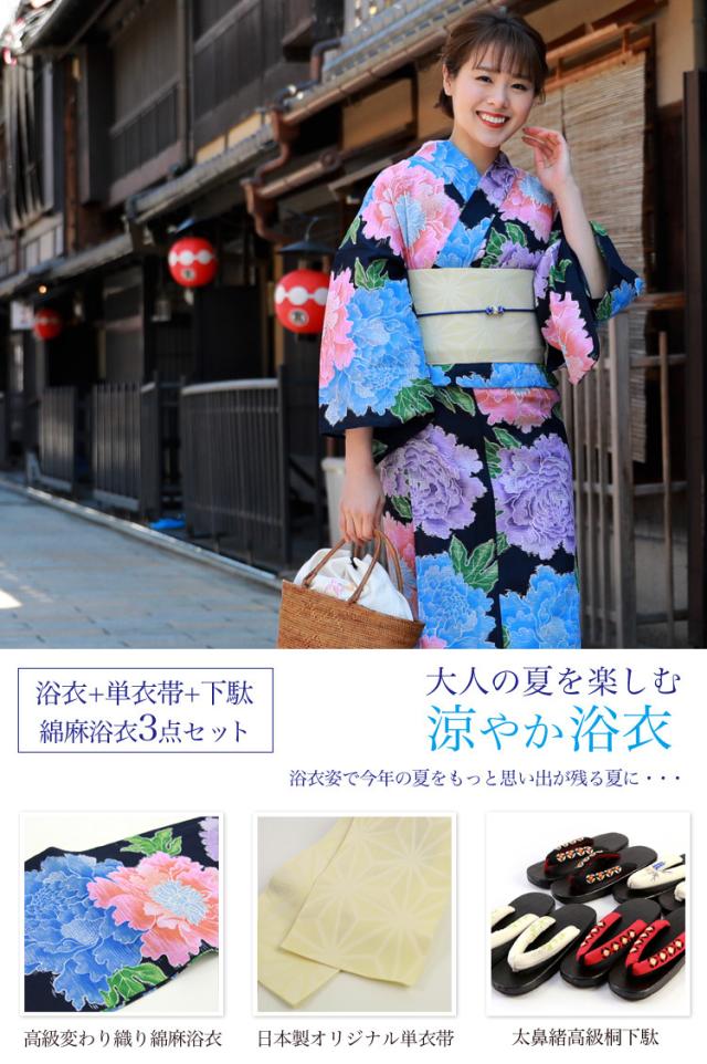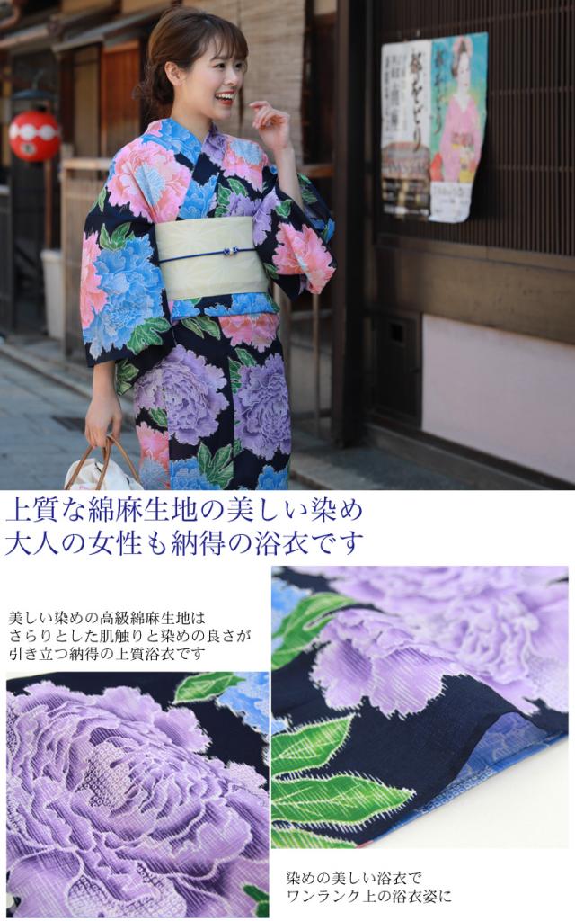 浴衣 セット レトロ 大人 レトロモダン 高級変わり織り綿麻浴衣3点セット「紺地に赤・青・紫の牡丹」浴衣 紺 青 牡丹 レディース 古典柄 モダン
