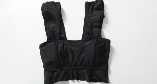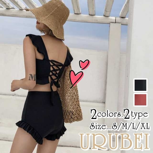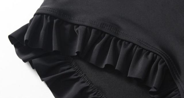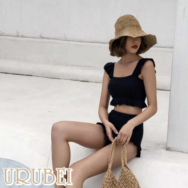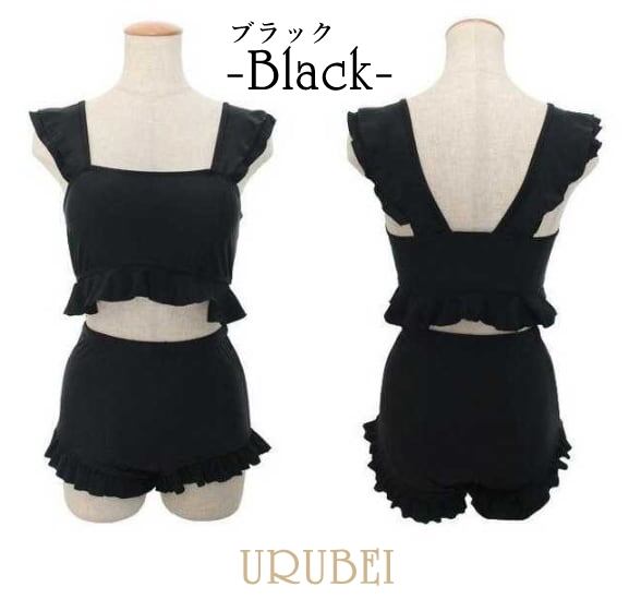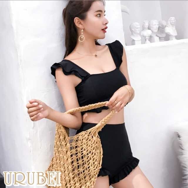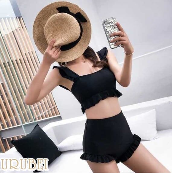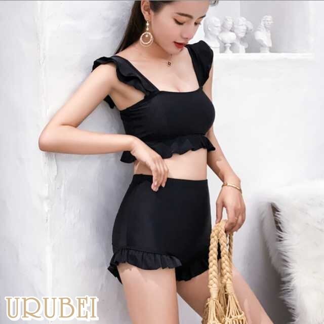 即納 即日発送 在庫処分 2020新作水着 水着 ビキニ 2点セット 黒 かわいい 水着 ビスチェ ハイウエスト レディース フリル ビスチェ ビキニ 体型カバー パッド付き 無地 モノトーンブラック 黒 ビーチ 夏新作 水20 水30
