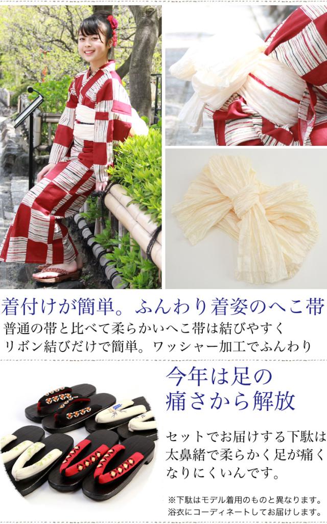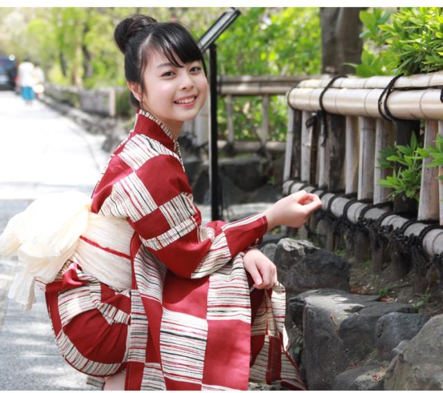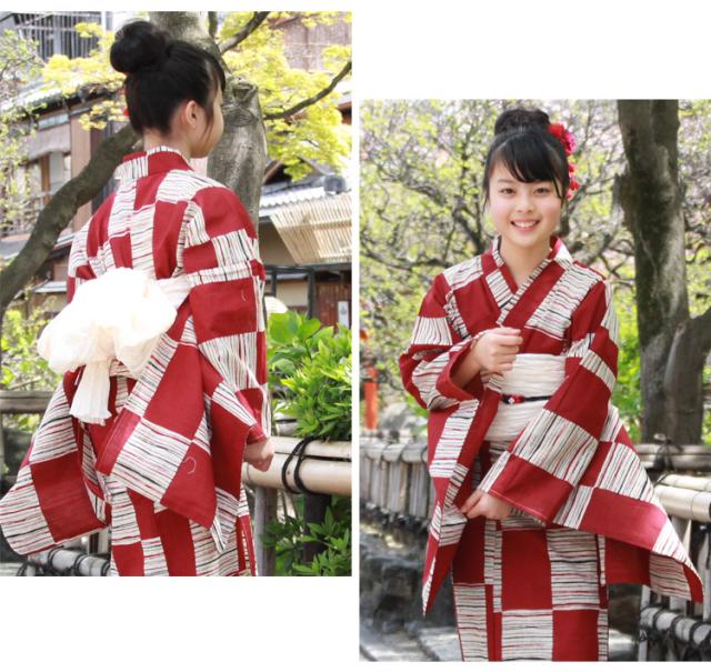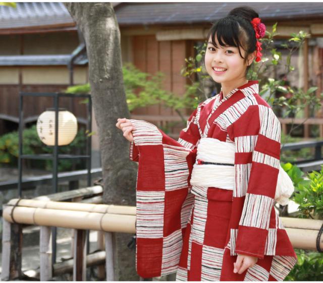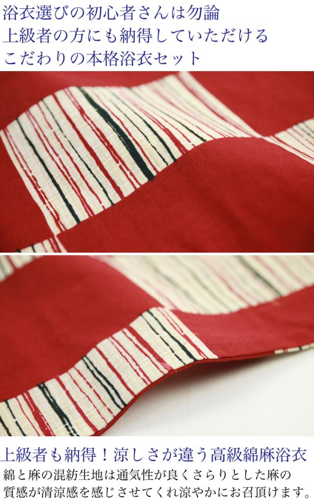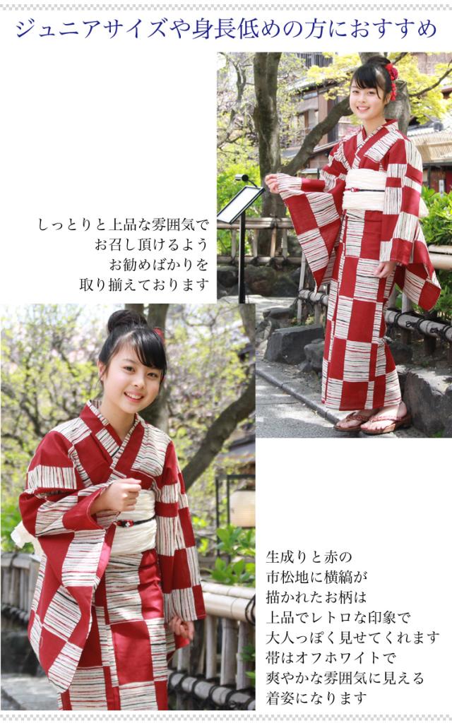 浴衣 セット ジュニア レディース 綿麻浴衣3点セット 「生成りと赤の市松模様に縞」 へこ帯 Sサイズ 子供 レトロ モダン 150cm 140cm