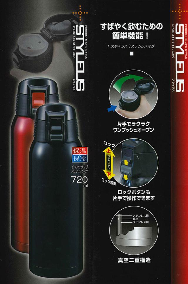 タフコ スタイラス ワンプッシュ式 携帯マグ 720ml 保温 保冷 魔法瓶 ステンレス ワンタッチ 水筒 ブラック レッド(代引不可)