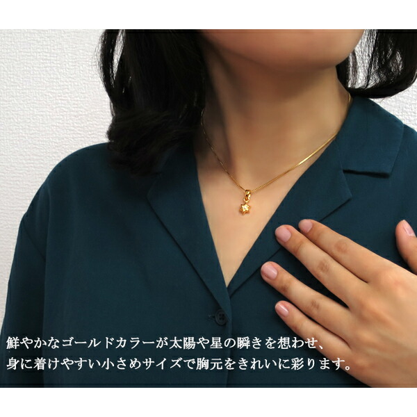 鮮やかなゴールドカラーが太陽や星の瞬きを想わせ、身に着けやすい小さめサイズで胸元をきれいに彩ります。