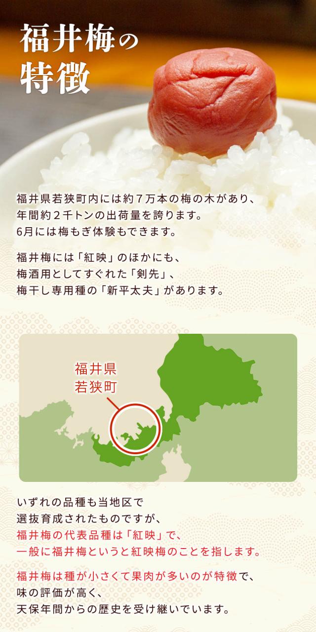 | ●原材料名 梅 漬け原材料〔食塩、還元水飴、砂糖、発酵調味料〕 調味料(アミノ酸等)、酸味料、ユッカ抽出物、 ビタミンB1 (原材料の一部に大豆を含む) ●原料原産地名 福井県産(梅) ●塩分 10% ●内容量 120g ●酸度 中(約2.7%) ●賞味期限 180日 ●保存方法 直射日光を避け冷所にて保存 ●商品特性 適度の酸度、さっぱりした口当りのおいしい梅干 無着色の梅干です。 | ●原材料名 梅 漬け原材料〔食塩、しそ〕 ●原料原産地名 福井県産(梅) ●塩分 15% ●内容量 120g ●酸度 強い(約3%) ●賞味期限 180日 ●保存方法 直射日光を避け冷所にて保存 ●商品特徴 塩としそだけで漬け込んだ梅干 合成着色料など一切なし |