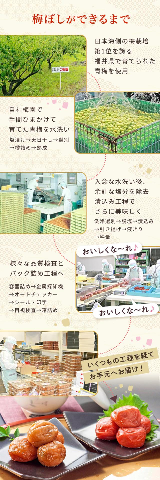 | ●原材料名 梅 漬け原材料〔食塩、果糖ブドウ糖液糖、発酵調味料、 はちみつ〕 調味料(アミノ酸等)、酸味料、ユッカ抽出物、 ビタミンB1、 甘味料(ステビア) (原材料の一部に小麦を含む) ●原料原産地名 福井県産(梅) ●塩分 7% ●内容量 100g ●酸度 弱い(約2.4%) ●賞味期限 180日 ●保存方法 直射日光を避け冷所にて保存 ●商品特性 ほんの〜り甘く、上品な口当り お茶受けにもいける逸品! | ●原材料名 梅 漬け原材料〔食塩、砂糖、還元水飴、発酵調味料、こんぶエキズ〕 調味料(アミノ酸等)、酸味料、ユッカ抽出物、 ビタミンB1、 (原材料の一部に大豆を含む) ●原料原産地名 福井県産(梅) ●塩分 8% ●内容量 100g ●酸度 中(約2.5%) ●賞味期限 180日 ●保存方法 直射日光を避け冷所にて保存 ●商品特性 こんぶのうまみがたっぷり! まろやかでコクのある味が人気! |