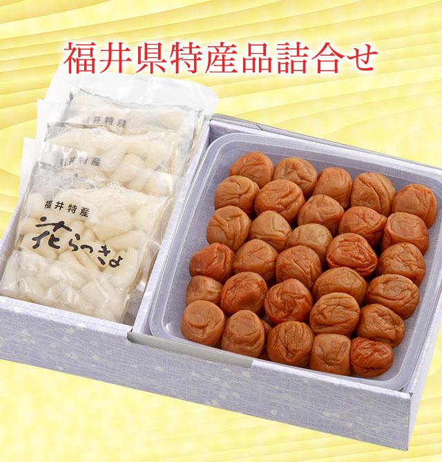 さっぱりした味わいが人気の「うす塩味・福梅ぼし」(塩分10%)と福井県三里浜の純白で歯ざわりが良い「花らっきょう」の特撰セットです。