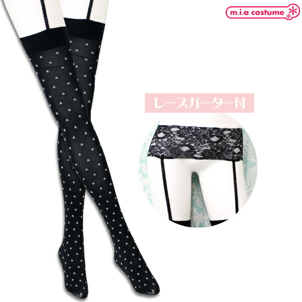 1305C■【送料無料・即納】 レースガーター付ニーハイソックス 色:黒×白スター柄 サイズ:M-L ニーソ オーバーニー