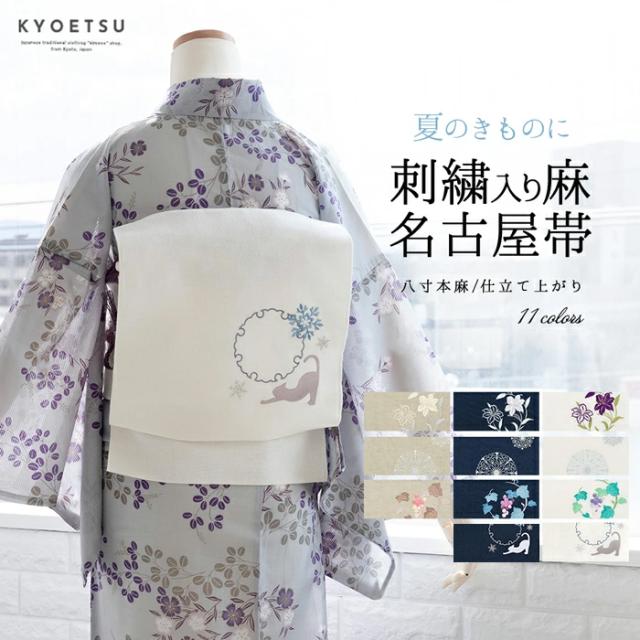 (日本製 名古屋帯 麻 刺繍入り) お仕立て上がり洗える名古屋帯 小紋 紬 着物 八寸名古屋帯 夏用 華紋 蔦 ぶどう 百合 ねこ(rg)