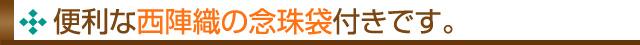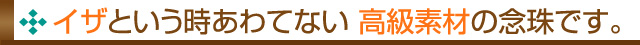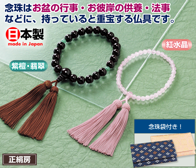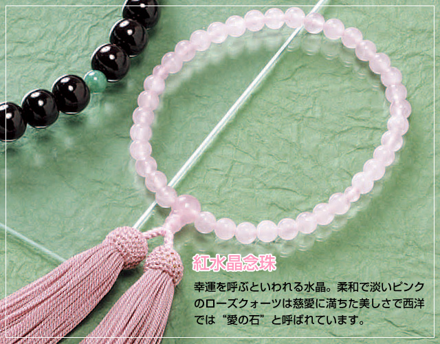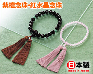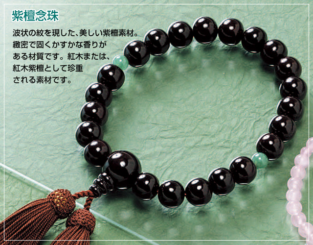 イザという時にあわてない高級素材の念珠です。念珠は、お盆の行事・彼岸の供養・法事などに、持っていると何かと重宝する仏具です。【紫檀念珠】波状の紋を現した、美しい紫檀素材。緻密で固くかすかな香りがある材質です。紅木または。紅木紫檀として珍重される素材です。【紅水晶念珠】幸運を呼ぶといわれる水晶。柔和で淡いピンクのローズクォーツは慈愛に満ちた美しさで、西洋では愛の石と呼ばれています。便利な念珠袋付きです。西陣織。
