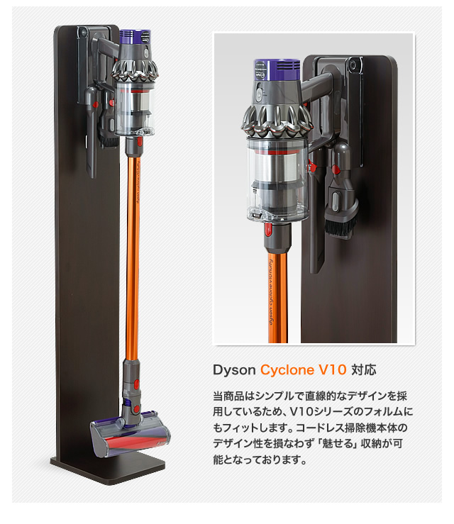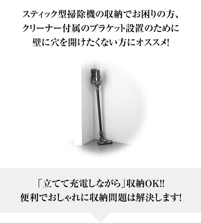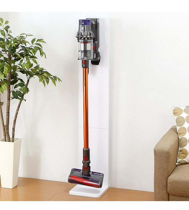 ダイソンのコードレス掃除機を「立てて充電しながら収納できる」スリムタイプのクリーナースタンド。お客様の声にお応えし、無駄な機能を省いたシンプルなデザインに。インテリアに溶け込む邪魔にならないサイズにシェイプアップ。壁に穴を空けネジ止めしなければ使えないダイソン付属の収納用ブラケットを壁を傷つけずに使用できます。ダイソンコードレスクリーナーV8シリーズ、マキタ製コードレスクリーナーにも対応。