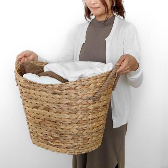 大きめサイズのバスケットです。洗面所でのバスタオルや洗濯物を入れるランドリーバスケットにおすすめです。リビングではブランケット入れ、玄関では上着やかばんなどの大きめの物を入れるのにぴったりです。