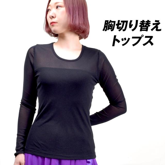 トップス ダンス衣装 社交ダンス衣装 フラダンス衣装 シースルー メッシュ 長袖 丸首 伸縮素材 切り替え レッスン着 BD94109[M便 1/2]