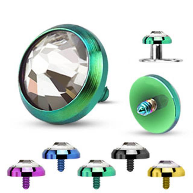 サージカルステンレス316L製の地金にチタンのIPメッキをしたパープル、グリーン、ブルー、ゴールド、ブラックの台座にキュービックジルコニアをセットした内ネジタイプのボディピアス用キャッチ。