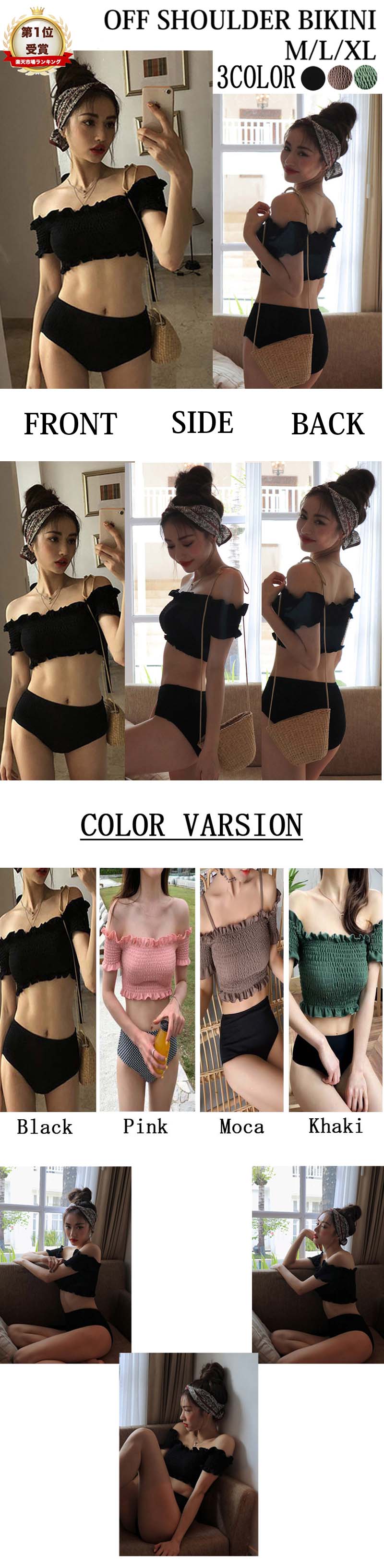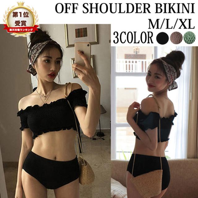 水着 レディース ビキニ 体型カバー ハイウエスト 水着 2点セット 二の腕 カバーアップ 肩だし 肩あき パッド一体型 ワイヤー入り リブニット 2way オフショルダー オトナ女子 セクシー お洒落 可愛い 即日発送